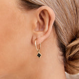 עגיל חישוק עדין, מקושט בתליון בצורת יהלום בצבע אמייל שחור או אדום ותלוי על חישוק קטן עשוי זהב 14 קארט שיוסיף את הנצנוץ המושלם לאוזן שלך